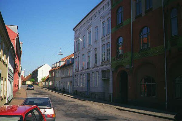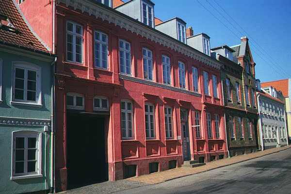 Gaden hedder Naffet og er fyldt med interessante bygninger; her nr. 5, opført for hattemager Andreas Fischer mellem 1799 og 1805.